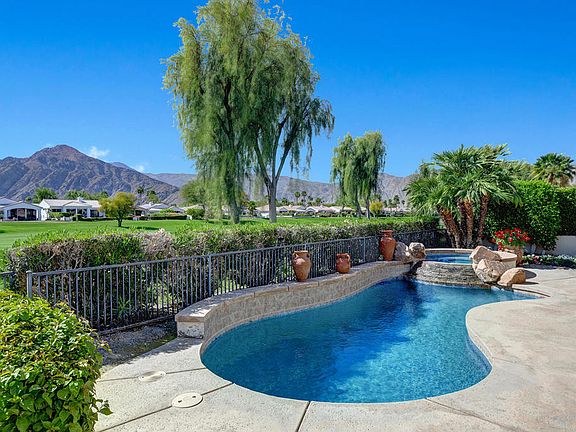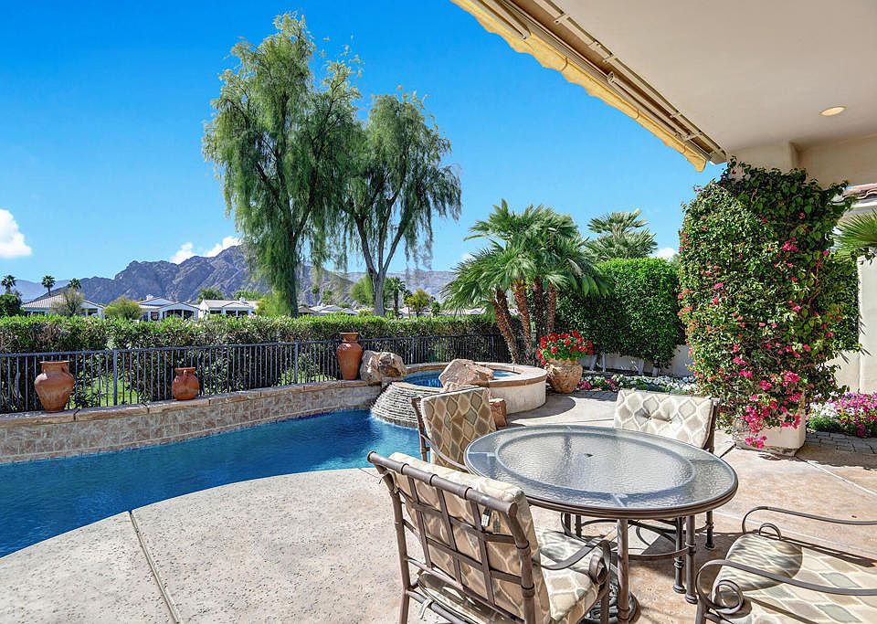 Stunning south-facing Valencia Plan 2 home in The Citrus community, perfectly situated on the 8th fairway with breathtaking mountain views. This beautifully remodeled home, offered fully furnished, blends elegance with modern updates and a highly desirable layout.Featuring 3 bedrooms plus a den/office and 3.5 bathrooms, this home includes a detached casita, perfect for guests. The inviting center courtyard with a built-in fireplace creates a warm and welcoming ambiance. The outdoor backyard space is ideal for relaxing and enjoying the picturesque golf course and mountain views, complete with retractable awnings for added shade and comfort.A major renovation in 2022 enhanced the home's style and functionality, including new kitchen countertops, sink, faucet, garbage disposal, backsplash, a new microwave oven, and a new refrigerator. The powder room was updated with a new countertop, sink, and faucet, while the bar area also received a new countertop, sink, and faucet.Located in the private, guard-gated Citrus community, this move-in-ready home offers the perfect blend of luxury, comfort, and breathtaking surroundings. Don't miss this incredible opportunity to own in one of La Quinta's premier communities!