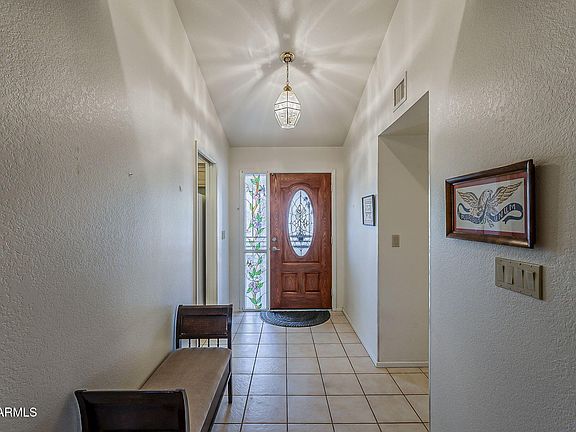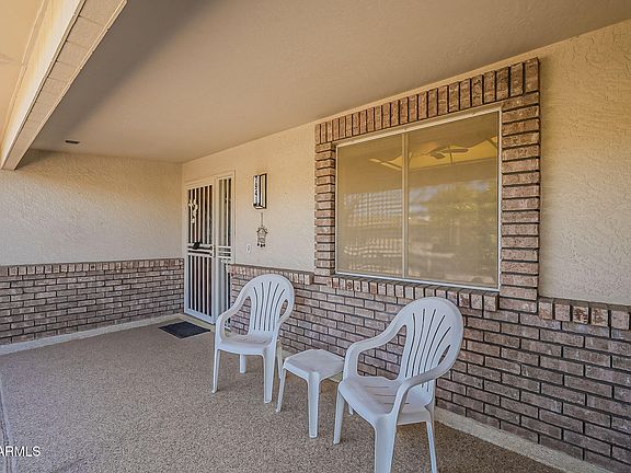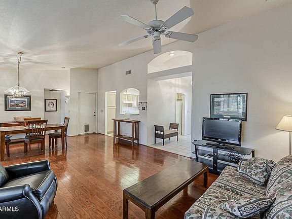 Enjoy the bright Arizona room with access to the south-facing backyard, perfect for year-round enjoyment. The split-bedroom layout offers privacy, with the spacious primary suite on one side and the guest bedroom near the guest bathroom featuring a full tub/shower bath on the other. The home features vaulted ceilings in the living room, a formal dining area, plus eat-in space in the kitchen for flexible dining options. Low-maintenance front landscaping includes decorative rock and accented turf, adding curb appeal without the upkeep. Located in an age-restricted community with low annual HOA fees and endless amenities clubs, activities, pools, golf, and more. Truly, if you're bored here, it's by choice there's something for everyone!