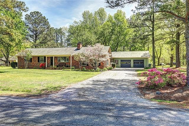 Minutes from Historic Rt. 5 and the VA capital bike trail sits this 1728 sq. ft. all brick ranch home. Huge 1.36 Acre corner lot with circle drive. Original wood floors, updated eat -in kitchen with double ovens, Corian counter and tile backsplash. Large laundry room. Formal Living or Dining room with wood fireplace, Huge exposed beamed ceiling Family room with wet bar, separate entry and another wood burning fireplace. 3 bedrooms with 1 full and 1 half bath. Covered and screen breezeway to oversized 2.5 car garage. Beautiful landscaping. New HVAC and Duct work in 2017. Dog Pen.