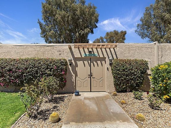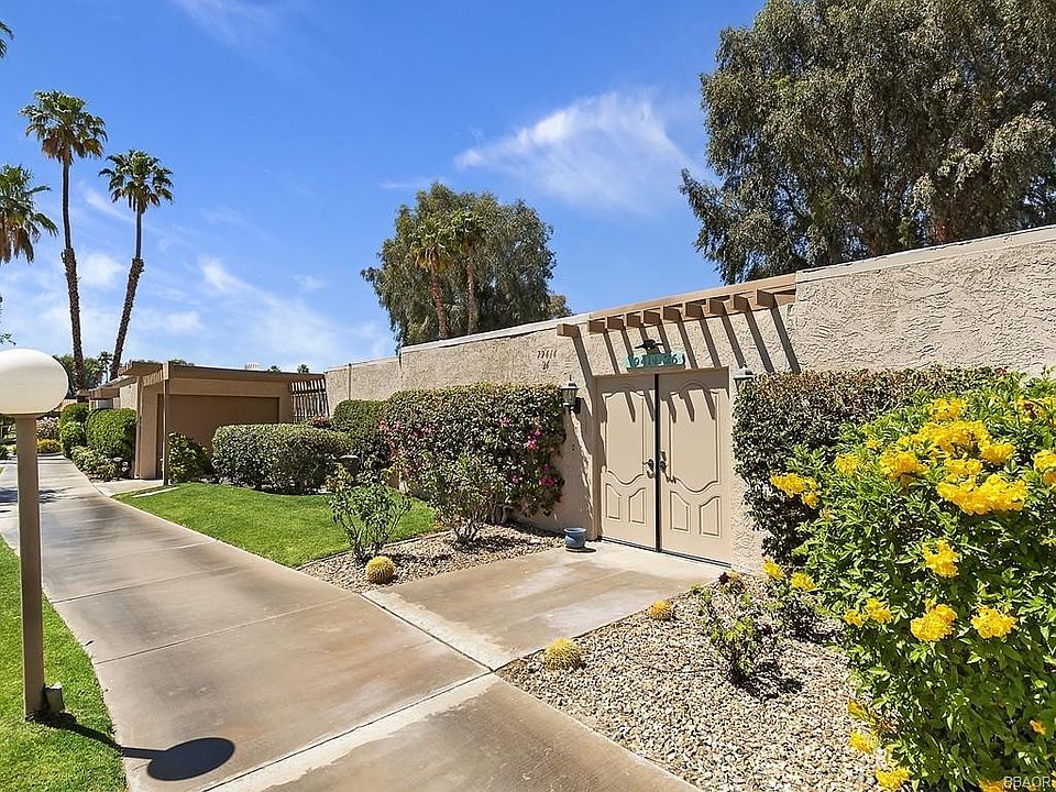 Spacious Condo in a desirable area of the Bermuda Dunes Country Club. Upon entering this single story condo yours eyes will be immediately drawn to the driving range & views of the surrounding Chocolate Mountains. High ceilings & recessed lighting when you enter the great room. This home offers a gorgeous three-sided gas fireplace in the living room, dining room and kitchen. The kitchen is open & spacious complete with a large pantry and breakfast bar. There are two large master suites with walk-in closets. Second bedroom has additional space for an office, sitting or exercise room. Enjoy the front tiled ptivate spacious courtyard and access to a workshop or extra storage space. Off of the back patio you will find a golf cart garage and a tiled patio (with ceiling fan) facing the golf course and mountain views.