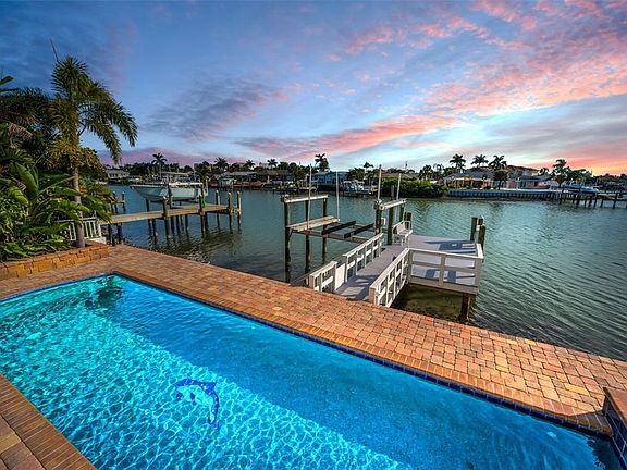 CLOSE TO THE BEACHES, THIS SPACIOUS AND BEAUTIFULLY UPDATED WATERFRONT RESIDENCE OFFERS RAPID ACCESS TO THE GULF. Boasting elegant high-quality finishes inside and out, you’ll love the attention to detail of this impressive home. A fine double door entry opens to an exceptional multi-function great room plan with stately columns and lovely water views. The exciting and sumptuous Euro-style kitchen enjoys a massive quartz island bar, porcelain farmhouse sink, Subzero/Wolf/Bosch SS appliances, gas cooking, rich contemporary cabinetry and resplendent tilework, all complemented by radiant under-cabinet lighting. You’ll appreciate the full-size laundry area with storage, as well as the extensive storage areas accessible from within the garage. Step up to a half level that supports two bedrooms (one facing the water) and a superb full bath with glass shower enclosure and striking minimalistic dual vanities. The owner’s suite level provides a huge primary bedroom (water-facing), private access to a terrific, covered waterfront balcony, and a gorgeous custom walk-in closet system with an inspiring array of specialty pull-outs. The owner’s bath enjoys additional closet storage, exquisite dual quartz vanities, a Jacuzzi jetted spa tub and a large designer-tile multi-head walk-in shower system. The 4th bedroom (or office/den), with private luxury full bath, includes stairway access to a 17ft-deep 190sqft observation room with commanding 270-degree views of the waterways; observation room is ideal as a mini art studio or reading room. A 375sqft multi-purpose lower-level game/fitness area opens to a dazzling 460sqft covered lower-level entertainment deck with a wonderful SS outdoor gas cooking center, wide bar area, and generous dining/lounging space. The sizable pavered deck encases a substantial Pebbletek Pool and spa (installed in 2020), and the deck transitions to an updated seawall and composite dock with seating bench, shower, and large-capacity lift with excellent boating water. New metal roof (2025), Generac gas generator, hurricane impact windows and doors, and many, many extras. An outstanding value in a highly desirable location. Dimensions are estimates, buyer to verify.