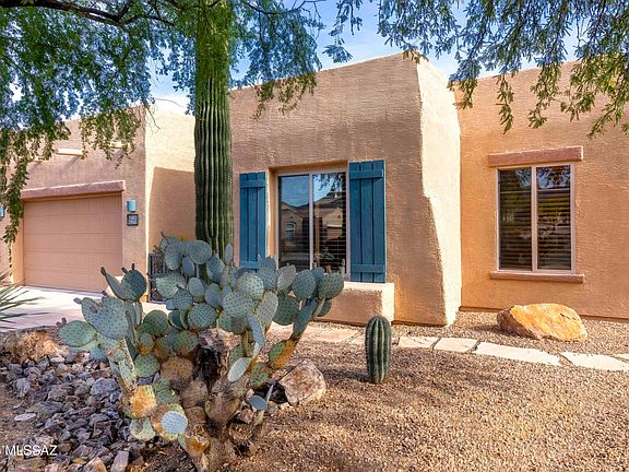 Situated on a premier lot in Continental Reserve, surrounded by natural open space on 2 sides, this exceptional home features a heated pool, spa and peaceful flowing stone waterfall with great privacy & Catalina & Tortolita Mountain views! Immaculately maintained inside and out- 2537 SqFt-3 Bds+Den (with double doors), 3 bths, and 3car tandem garage with built-ins too! Includes 10' ceilings, 20'' diag-set porcelain tile+LVP throughout w/ only one spot of carpet at owner's closet. Enjoy a warm palette w/ hickory cabinets, custom stained hardwood shutters, and artist painted beehive fireplace and accent walls. The kitchen features black galaxy granite, lots of storage, spacious pantry, & a large curved island with seating.Newer gas range+220Volt Advantium micro provides dual-oven capability The owner's suite includes custom closet built-ins, while a secondary bedroom showcases elegant wainscoting + crown molding. Step outside to your resort style backyard with it's free form heated pebble sheen pool with beach, in-floor cleaning AND a large hot tub! Enjoy the beautiful desert evenings with the sounds and sights of the beautiful custom rock waterfall, outdoor fire pit with gas OR wood ability, built-in seating and an outdoor kitchen equipped with a newer natural gas Stainless Steel (inside AND out) BBQ and beverage fridge. Plus find your own thriving Mexican lime tree admired by all. Additional highlights include a gated front courtyard with fountain, an additional covered side patio off the dining room and a 3-car tandem garage with custom shelving. Refrigerator in Kitchen, washer/dryer (electric), Bosch Dishwasher, Reverse Osmosis, Water Softener, Outdoor SS BBQ, & Beverage center all are included. Tesla solar lease-installed 2015 transfers easily for low electric bills. Current monthly solar lease is $161.25. This quality built 2X6 framed home features blown-in cellulose insulation on exterior walls and even has interior insulation at select interior walls for sound proofing. Roof was recently serviced, Newer A/C Unit, Newer Water Heater & Pool Heater was also recently replaced. A rare, beautifully upgraded home inside and out!