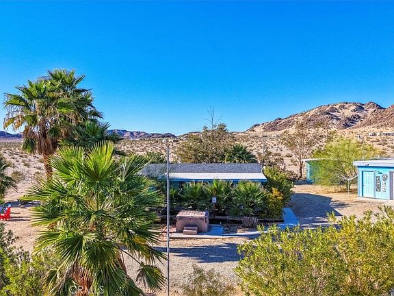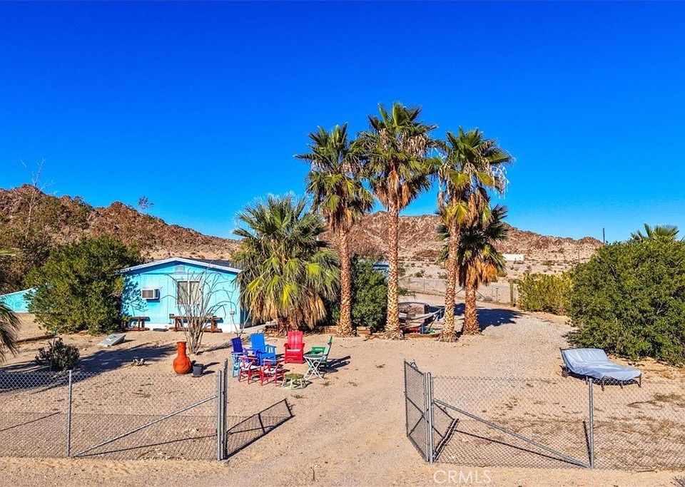 Walk beneath the palms and feel the world quiet. Step through the gate of Blue Desert Oasis and you cross a threshold—leaving behind the open Wonder Valley expanse for a space made lush by care and vision. Mature palms sway above desert blooms, the air cool beneath their shade. The home sits on five fully fenced acres, its own private well sustaining this tranquil retreat near the base of the Valley Mountains. The shaded front porch sets the pace—slow, grounded, welcoming. Inside, the main living area opens wide with tile floors, generous windows, and clean desert light. The kitchen carries a handcrafted warmth with Talavera tile counters and rich wooden cabinetry, partially open to both the dining and living rooms. The bathroom features a walk-in shower and pedestal sink, and the expansive bedroom—large enough to feel almost like a studio of its own—offers outdoor access and ample closet space. Beyond the walls, the property continues to unfold: a detached two-car garage with laundry, two additional sheds (one powered), and carefully tended landscaping that softens the desert’s edges. From the yard, the view sweeps from the nearby Valley Mountains to the distant Pinto range of Joshua Tree National Park. Currently a beloved short-term rental, Blue Desert Oasis carries a history of arrival—each guest crossing that same quiet threshold into calm. Whether you keep it as a retreat for others or claim it as your own, this place waits patiently, ready to welcome whoever steps through the door next.