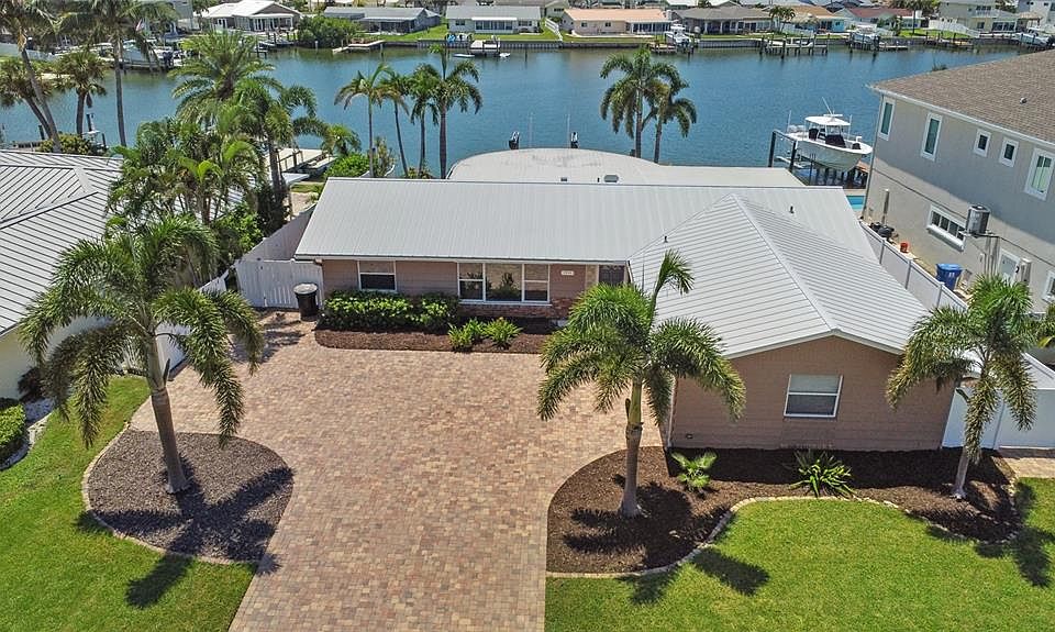 Welcome to Yacht Club Estates — one of St. Petersburg’s most sought-after waterfront communities! This boater’s paradise offers direct access to the Gulf of Mexico with three navigable routes and no fixed bridges. Perfect for entertaining and relaxation, the backyard is a true retreat with a sparkling pool and spa featuring three waterfalls, a sun shelf for lounging, a pool bath, and a cozy firepit. For boating enthusiasts, the private dock includes a 9,000 lb. lift, making days on the water effortless. Inside, the home blends comfort and functionality. Recent upgrades include a durable metal roof, new vinyl laminate flooring with updated baseboards, and a newer AC system (2022). The living and dining areas flow seamlessly into the family room, where a wall of windows frames peaceful water views. The centrally located kitchen features a breakfast bar, dinette with built-in cabinets, and a convenient closet pantry. The split floor plan offers privacy, with the master suite tucked away on one side of the home. It features a walk-in closet and sliding doors to the patio for easy access to the pool and waterfront. Two additional bedrooms share a hall bath; one also enjoys sliding glass doors with serene canal and pool views. Yacht Club Estates is a voluntary HOA community with no mandatory fees, ideally located just 20 minutes from vibrant Downtown St. Petersburg, dining, and entertainment. The home did experience minimal flood damage with water limited to the front portiion of the home, which has since been professionally remediated.