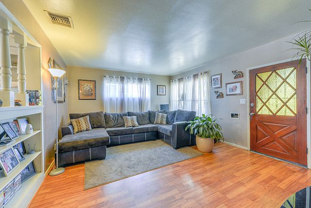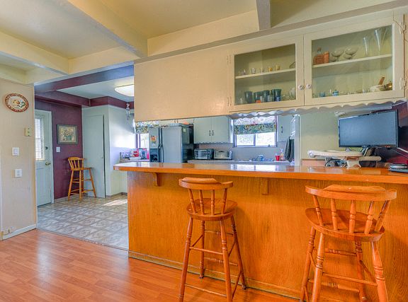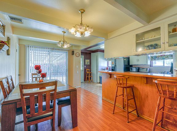 Well Maintained Home on Large Lot. This two bedroom home features an open floor plan and a large fenced in yard on a quiet street. When you walk into the home you are greeted by a good sized living room that is open to the dining room and kitchen. The home has laminate flooring throughout the living space. The kitchen features a breakfast bar, gas range, double oven and a pantry. The bathroom has tile flooring and dual sinks. There is a slider off of the dining room that opens up to the covered patio. The large private back yard is ideal for entertaining. The detached garage houses the laundry hook ups and a toilet.