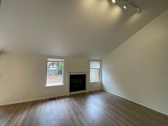 The low maintenance backyard with patio provides a quiet sanctuary. Living room with vaulted ceilings and cozy fireplace continues the serenity.