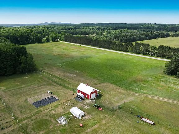 Imagine! Your own 38 acre paradise in Sought-after Benzie County & Sleeping Bear Dunes National Lakeshore. Currently utilizing only organic inputs to this permaculture farm & growing over 26 varieties of fruit & berry crops within 8 foot fence enclosure with room for significant increase in production, including south-facing slope for grapes. Drip irrigation system fed by 30 gpm well. Also 2 acre pollinator reserve and approximately 13 acres of mixed hardwood & maple forest. Features a large pole barn with great front porch, upstairs finished space, full bathroom and 2 large doors for access. Great dark sky area with beautiful scenery, easy access to wineries, Traverse City numerous lakes & rivers and Lake Michigan beaches.