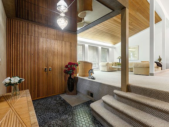 This spacious mid-century split-level home offers three levels of above-grade living space plus a full sub-basement, providing exceptional room for everyone to enjoy. Ideally located near beautiful parks, shopping, dining, and top-rated schools, this home combines convenience, space, and value. Step into the inviting foyer featuring eye-catching mosaic tile flooring and stylish wood slat accents, including matching doors. The sun-filled living room boasts soaring vaulted, paneled ceilings and three oversized windows that flood the space with natural light. An open-concept dining area offers room for a large table, recessed lighting, and elegant wall sconces-perfect for both everyday living and entertaining. The eat-in kitchen includes light flat-panel cabinetry with a pantry, wood-look flooring, white appliances, and space an eating area with bay windows and space for a table for 6. The walk-out lower level, fully above grade, features a generous family room with paneled walls, a wet bar closet with mini fridge and two burner stove, and a newer sliding glass door that opens to the patio. A convenient powder room with an oversized vanity completes this level. Upstairs, you'll find four spacious bedrooms and two full bathrooms, including a large primary suite with its own private bath. Three additional bedrooms share a well-appointed hall bath. The sub-basement offers high ceilings and endless possibilities-currently used for laundry and storage, it could easily be finished to create even more living space.