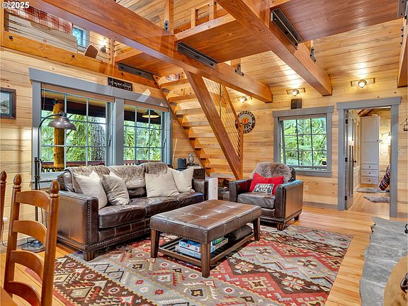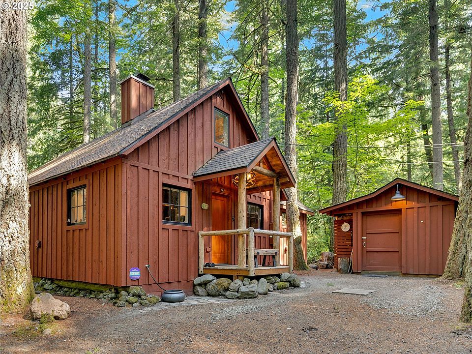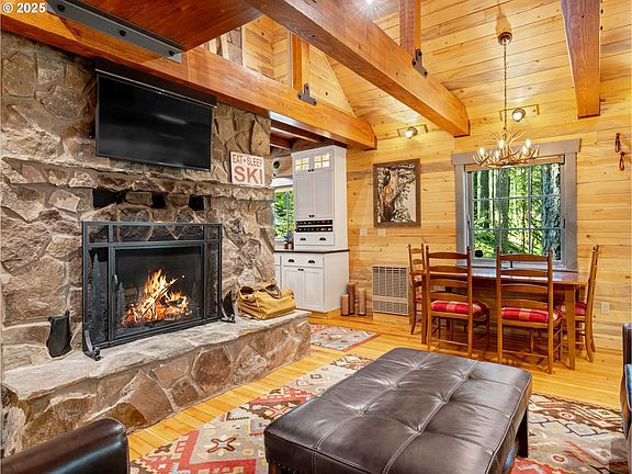 Once in a blue moon, a Zig Zag riverfront cabin like this comes along. Taken down to the studs in 2018, this hard-to-find charmer was rebuilt with craftsmanship and attention to every detail. The stone fireplace anchors the living room with wood floors, vaulted ceilings, and paned wood windows framing natural light. Blue pine tongue and groove paneling wraps the interior, and propane radiant wall heaters keep it cozy.Step from the covered porch into a mud/utility room with stack washer/dryer, storage, benches, and heated tile floors. The country kitchen features honed quartz counters, farm sink, propane stove with off-grid capability, dishwasher, and abundant cabinetry with stacked lighted glass uppers.A barn door leads to the new bath with mosaic-tiled shower, glass door, heated tile floor, cabinetry, new fixtures, and updated plumbing. The main-level primary suite is a new addition with vaulted beamed ceiling, fir floors, built-ins, and custom bed frame with storage.Thick wood stairs with cable railings lead to a catwalk overlooking the living room. Two bedrooms sit at each end, with built-in bunks and storage.A Dutch door opens to a rebuilt covered deck for listening to the Zig Zag River. A private bridge leads to the water’s edge.Extras include fiber internet, tankless hot water, shed with workbench and firewood storage, gated drive, owned propane tanks, new lighting, HVAC air circulation, security system, generator, and more.Sold furnished with few exclusions. Only 10 minutes to skiing and close to groceries, restaurants, and coffee. Hiking, biking, snow shoeing and cross-country skiing just out the doorstep. Located on leased land in the Mt. Hood National Forest. Only one hour from Portland! Offer deadline 5:00 pm 9/23.