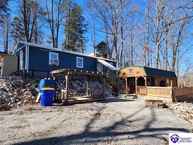 Perfect weekend lake property located in Sunset Harbor. This property has 2 buildings. The first building is a 242 sq ft (per PVA) tiny home with a full kitchen, full bath, loft refrigerator, stackable washer/dryer, electric stove, a small kitchen w/ sink, window unit ac, space heater heat, a full bathroom w a stand up shower, a single vanity, and an electric water heater. There is also a 4 person hot tub that may or may not stay depending on the offer (hot tub negotiable). The larger building is 864 sq ft (per PVA) and it has 3 bedrooms, 1 nice bathroom w/ double bowl sinks and a deep soaking tub, a large living room, a wood burning stove, with laminate flooring throughout. There is an ADT security system that shall remain w/ the home if buyer wishes to take over the payments. Both structures are amish built There is also a tall, pontoon carport, gravel driveway, level fire pit area perfect for those evenings after a day on the lake. This property is located only 1/4 mile from the neighborhood boat ramp, and would make a nice income producing Air BNB for that investor looking to invest in the Nolin Lake area. Don't delay. Call Bluegrass Realty Pros today to view this fine lake property set up.