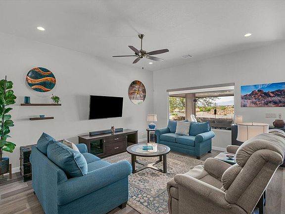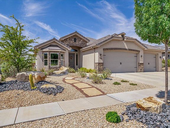 Perched high on an elevated lot with sweeping, unobstructed views, this home was designed to make every day feel like a getaway. From the moment you arrive, the curb appeal and thoughtfully landscaped, low-maintenance yard set the tone for easy living. Inside, soaring ceilings, eight-foot doors, and walls of picture windows flood the open concept floor plan with natural light, creating a bright and inviting atmosphere. The kitchen is a showpiece with custom painted cabinetry, an oversized pantry, and striking granite counters that flow seamlessly into the matching backsplash. Gather with friends and family in the spacious living areas, then step outside to a generous covered patio with drop-down privacy shades—perfect for sunset dinners or quiet mornings overlooking the valley. The three- car garage provides abundant parking and storage for all your desert toys. Built with premium energy-efficient features, this home offers comfort and cost savings year-round. Tucked within a beautiful community with a low HOA, you'll enjoy easy access to nearby parks, shopping, dining, and endless outdoor adventures in Snow Canyon, Sand Hollow, and world-famous Zion National Park. Buyer/buyer agent to verify all information.