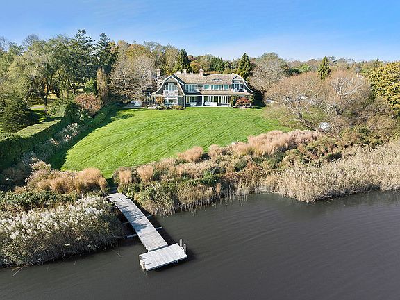 SF on 3 levels of living space with breathtaking views of the pond and the endless ocean beyond. Step inside to find a soaring two-story living room, anchored by a stately fireplace, a space where sunlight dances through expansive windows. An informal living room with wood clad ceilings is encased on three sides by windows and glass doors allowing the outside in. The heart of the home, an expensive kitchen, is equipped with the finest appliances, complemented by an enormous center island, a cozy sitting area with its own fireplace, flat screen TV and a charming breakfast banquet seating 12. Formal dining accommodates both sides of the family while intimate conversations find their places in the home's richly paneled library or sun-dappled sunroom with couches, ping pong and large screen TV, each featuring its own fireplace. Upstairs, the primary suite, a haven of serenity, with vaulted ceilings, luxurious bath, expansive dressing room, a private balcony, and an air of understated grandeur reigns over 4 guest suites plus an office. Four additional bedrooms are sprinkled about the residence with the staff quarters discreetly nestled on the first floor and finished lower level. A professionally outfitted gym, including a Smith machine, double cable machine, a full array of dumbbells, Peloton, treadmill, Elliptical and more informs your daily workouts. Outdoors, the estate is transformed into an entertainer's paradise thanks to the brilliance of landscape architect Edmund D. Hollander. A barbecue terrace invites convivial gatherings, complete with a pizza oven, a commercial-grade grill and a fire pit. The grounds are a sanctuary of leisure and recreation with both covered and uncovered patios. A 60' pool is complemented by a cabana with indulgent amenities including kitchen, bath, sauna, and outdoor shower. Nearby, a sunken Astro-Turf tennis court awaits spirited matches. Down by the water, a teak dock beckons, outfitted with storage racks and a shower for rinsing off after aquatic adventures. From here, windsurf, paddleboard, or row your way to the ocean beach, just a gentle journey away. This Bridgehampton waterfront is more than just a home; it is a realm of unparalleled elegance, offering every imaginable comfort. A jewel of the Hamptons, it stands as a sanctuary affording a fortunate few the opportunity to savor summer within its embrace.