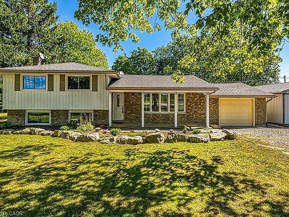 Welcome to this beautifully renovated 3-bedroom, 3-level side split home, ideally situated on a spacious corner lot. Combining modern elegance with rustic charm, this property offers the perfect blend of style, space, and functionality—ideal for families or anyone seeking a versatile home. Inside, luxury vinyl flooring flows throughout, creating a cohesive and durable foundation on every level. The heart of the home is a bright, open kitchen featuring a central island, sleek stainless-steel appliances, backsplash. Adjacent, the dining area opens via sliding doors to the backyard deck, seamlessly connecting indoor and outdoor living. The spacious living room is bathed in natural light from a large bay window and features a cozy electric fireplace, while pot lights throughout the main level enhance the inviting atmosphere, inside entry from garage. A rustic staircase with panelled walls leads to three comfortable bedrooms. The primary has been newly renovated and boasts a wall-to-wall closet with barnboard doors, merging rustic charm with modern design, and a newly renovated 5pc bathroom. The fully redone basement is a true highlight, offering a large recreation room perfect for family gatherings, hobbies, or entertainment. A dedicated office area provides an ideal space for remote work or study, and the laundry/mud room includes a convenient walk-up basement with a separate entrance—perfect for storage, added functionality, or private guest/in-law access. Step outside to your private country retreat. The backyard features a charming gazebo, a hot tub, a versatile workshop for projects and hobbies, and a thriving garden area. The driveway accommodates 10+ vehicles, easy in-and-out with two side driveway entrances, large corner lot 174.76 X 216 ft which you will appreciate. Recent updates include luxury vinyl flooring, renovated basement, primary bedroom, freshly painted interiors (2024), bath renovation (2025), B/I microwave, washer & dryer, water heater owned (2023).