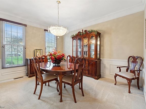 - Description: Dining room with newer carpet, wainscoting, crown molding and freshly painted.,Flooring: Carpet