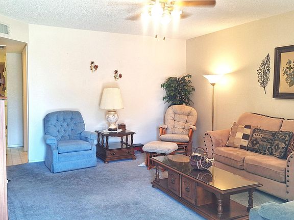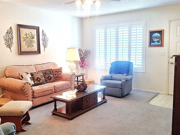 This fully furnished condo welcomes you with a spacious front patio that leads into a large living room accented by plantation shutters. The kitchen overlooks the family room and features raised panel oak cabinets, neutral countertops, white appliances, and a large pantry. The master bedroom includes a generous walk-in closet and a tile shower. Additional storage areas provide extra convenience. The back patio offers a view of the tree line greenbelt, and block wall.