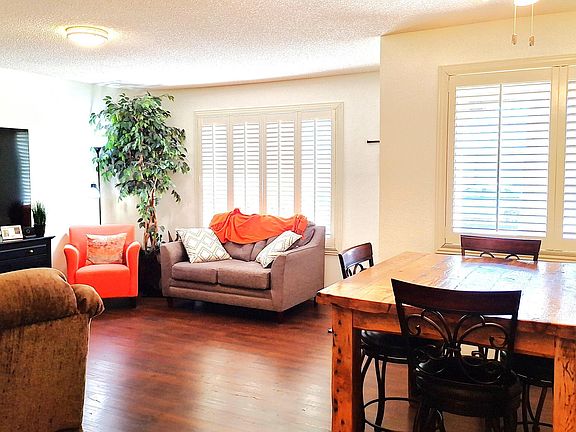 This gorgeous condo features a split-bedroom layout with a living and dining room with wood flooring and plantation shutters. The kitchen shows lots of raised-panel oak cabinetry, neutral countertops, upgraded stainless steel appliances, matching wood floors, and pantry.