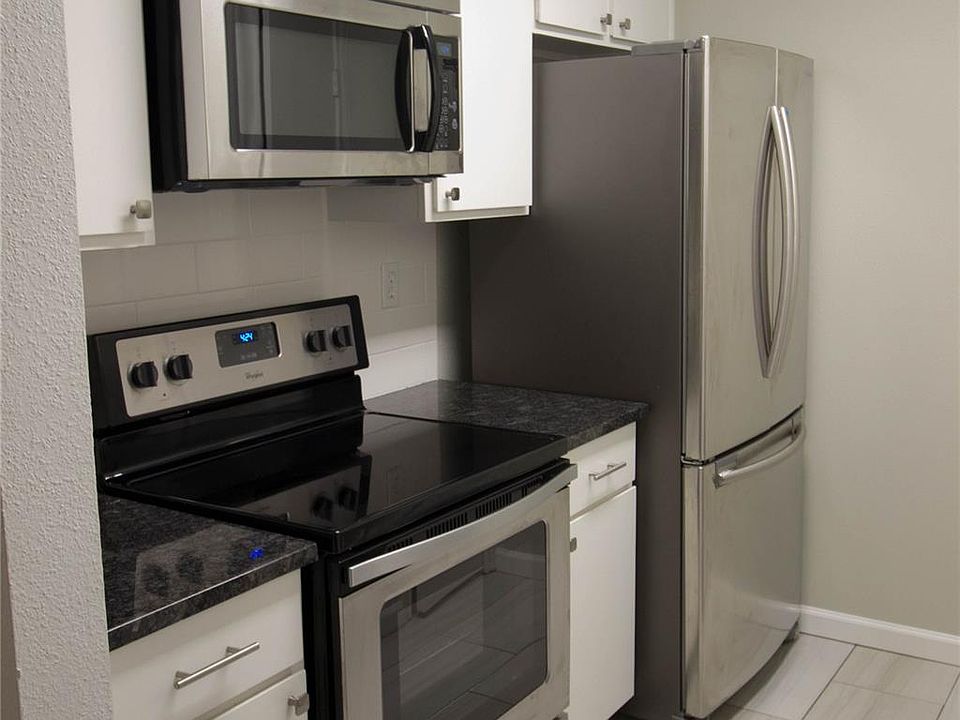 7950 N . Stadium #192 is an upper, 696 SF, 1 bedroom, 1 bath condo which has been extensively renovated in 2018 all new appliances: refrigerator (08/2022) , microwave, electric oven, dishwasher in the kitchen, and beautiful state-of-the-art 220 volt dryer and washer hidden behind folding doors in the bathroom. Granite countertops in the kitchen, recessed lighting in the bathroom, living room, and bedroom, as well as a decorative tile surround on the wood-burning fireplace, and a remote controlled ceiling fan in the large living area. Balcony with storage room. 5 min walk from Metro, walking distance to Kroger, Fiesta, Target. Zoned to Roberts Elementary, Pershing and Bellaire High