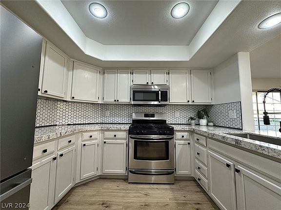 Newly Remodeled and ready to move in! Come see this beautiful 2 bedroom 2 bath condo located on the first floor with easy access from your assigned parking space. Pergo wood laminate and tile flooring set the stage throughout this home, granite countertops with upgraded edge and hexagon backsplash sets off the redesigned modern kitchen. The Community is gorgeous, well maintained and gated. It also has 3 sparkling resort style swimming pools and spas. Mature green landscape throughout entire community provides beauty year round and much needed shade in the summer! Less than a mile from Desert Breeze park, Spring Valley HS AND Spring Valley community park. Do not sleep on this one!
