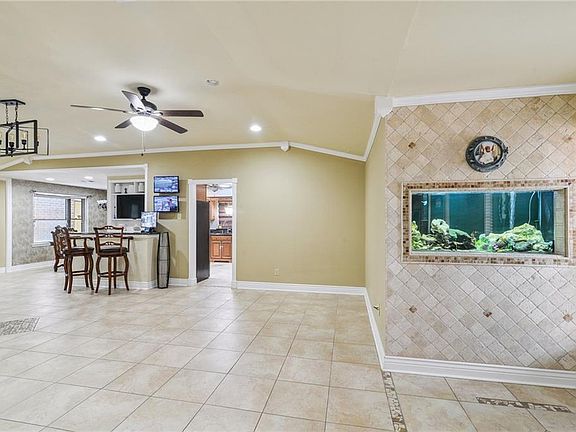 Enjoy outdoor living with a beautifully landscaped patio, gazebo, and TV area—great for gatherings. The property also includes a brick exterior, built-in fish tank, rear storage shed, two-car garage, and additional off-street parking. Low-maintenance concrete rear and side yards make upkeep easy.