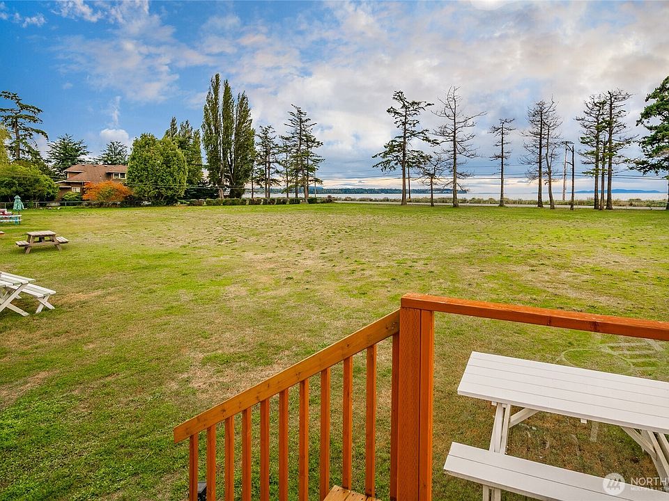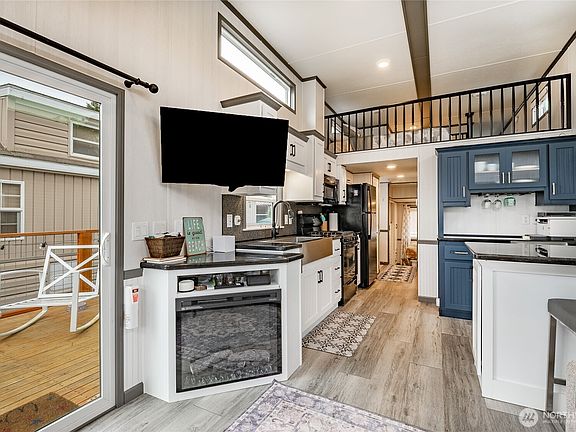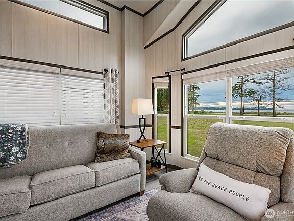 Birch Bay Waterfront Location! This turn-key home has everything! 2021 model with a light bright interior, kitchen island with room for dining, oversized farm sink and tons of storage. Living room takes advantage of the panoramic views with vaulted ceilings with surround windows, a fireplace and mounted Tv for the cozy nights. Bathroom has a step in shower for easy use, main bed has enough room on each side for access and the loft area can provide 2 extra sleeping options or flex space. Enjoy the full length deck with proper skirting around the unit and enough space for a compact car to park on the back end. Hands down the newest & best location in the park. Imagine unobstructed views year round from this little oasis!