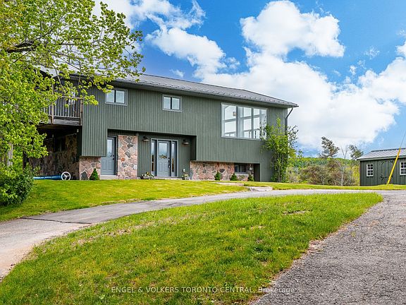 Follow the winding driveway to your private 56-acre retreat in the heart of Mono Township, an extraordinary estate that offers unparalleled tranquility and natural beauty. This recreational paradise boasts scenic trails, acres of majestic oak forest, a spring-fed pond, and a branch of the Nottawasaga Creek - home to native trout and bass. The custom-designed home blends rustic charm with refined comfort, with solid maple millwork and cabinetry, neutral tones and clean aesthetic throughout. The great room is the heart of the home, featuring a striking fieldstone fireplace and soaring windows that frame breathtaking views of the Escarpment. The upper level offers two bedrooms, an office, a den, a 4-pc bath, and an expansive deck overlooking the pond and its picturesque island. Step outside to enjoy the concrete saltwater pool, originally built by Sanelli and meticulously maintained by Solda Pools. A fully renovated 2024, self-sufficient two-bedroom, one-bath guest house with its own kitchen and laundry provides the perfect space for extended family, guests, or income potential. Just minutes from Hockley Valleys premier skiing and golf, Adamo Estate Winery, and Mono Cliffs Park, you are in an unbeatable location! Only 45 minutes from Toronto Intl Airport and 20 minutes to Orangeville, it offers the ideal blend of seclusion and convenience whether as a peaceful weekend escape or a year-round residence. Architect-designed with solar-friendly features, this one-of-a-kind property invites you to experience the Hills of Headwaters like no other.
