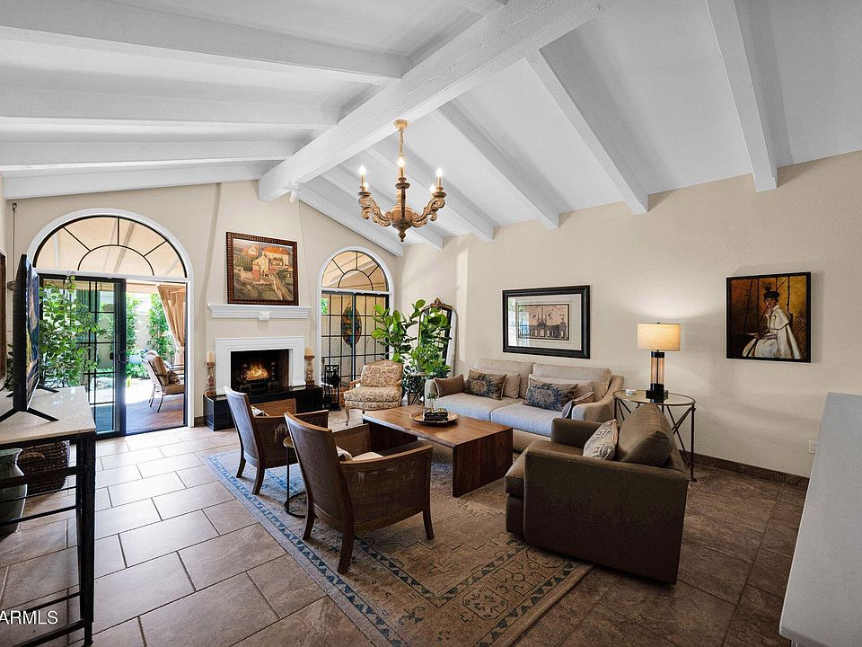 Immaculate and beautiful feels like a model home! Walk in and immediately feel comfortable at home with designer touches throughout! Awesome custom kitchen with huge cabinets and lovely breakfast nook on north side so perfect for morning cappuccinos or afternoon tea. Light and bright with large windows and skylights in all the right places. Cozy and inviting living room with vaulted ceilings, built in bookcase with warming wood burning fireplace. Nice and open living area overlooks spacious patio - large doors for extension of entertaining and extended family events! Wonderful area near Downtown Scottsdale in this highly desirable gated community moments from community pool, restaurants, Fashion Square shopping and cafes! Convenient Safeway and restaurants across the street too!