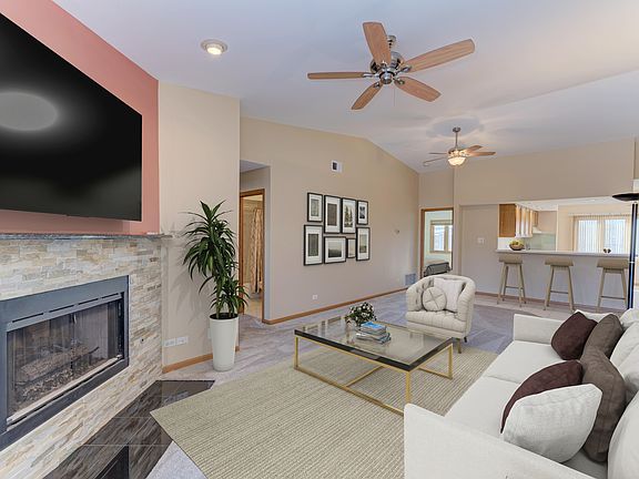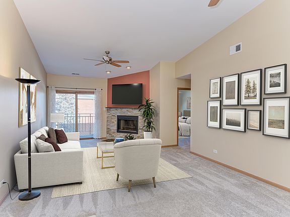 Beautiful, bright, and inviting move-in ready condo! The moment you walk through the door, you'll be welcomed by an open-concept layout, vaulted ceilings, and a gorgeous fireplace-perfect for relaxing or entertaining. The spacious eat-in kitchen features plenty of cabinet space and stainless steel appliances. The primary bedroom boasts dual closets and an en-suite bathroom for added convenience. Step outside to your private balcony, the perfect spot to enjoy your morning coffee or unwind in the evening. With in-unit laundry and move-in ready condition, settling in has never been easier! This home also includes a 1-car detached garage plus an additional parking space. Building is flexicore construction with sprinklers. Conveniently located near parks, the park district, schools, I-294, I-55, shopping and public transportation, this is a must-see!