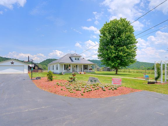 Check out the 3D view! This peaceful river home has 412 ft of New River frontage on 12 level acres, would make a beautiful wedding venue! Nice country farm house. Opens to a large foyer and hall, with gorgeous pine floors throughout the main level. Large windows in all of the rooms on the main level. Spacious, bright front room. Kitchen at the back of the house connected to a large dining room and den. Updated full bath-tile floors, newer vanity, jetted tub. Walk out to a 19 X 17 composite deck, hot tub; entryway to the separate 3rd bedroom upstairs. Barns, a chicken coop, well kept fences, pens, and various outbuildings surround the home. Large heated 2+ car garage. River view, shallow access from the property. Fish, swim, kayak, canoe, picnic at the water front! 12+ acres of adventure!