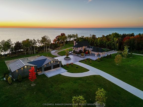 Indulge in luxury at this 13 acre Lake Huron estate, where meticulous craftsmanship and attention to detail converge to create an unparalleled retreat. The house boasts a main floor with two bedrooms, including a 3-piece en suite and a walkout to the patio/hot tub; complemented by an additional 2-piece bathroom, and lakeside windows offering breathtaking views. Enter the open-concept kitchen, dining, and living room; soaring to the ceiling of the second story, with second-level windows overlooking the lake; further enhanced by a butler's pantry, grand piano, office, and laundry/mudroom. Ascend to the second level, where four bedrooms, each boasting lake views, await; accompanied by a 4-piece bath with heated floors. The primary bedroom stands as a sanctuary, featuring a self-contained laundry room, retractable TV, gas fireplace, and expansive walk-in closet with built-ins. Even more impressive is the 6-piece en suite, offering floor-to-ceiling windows, heated floors, a tub, a bidet toilet with a heated seat, and a shower that doubles as a steam room. The third level boasts a 3-piece bath, storage room, and a fully equipped bar; while the rooftop patio offers unparalleled views of Lake Huron. The basement, an entertainment haven, features four bunk beds, an entertaining/ games area, hockey shooting room, a 3-piece bath, bar area, wine room, and a theatre room. The guest house features two full-sized change rooms doubling as luxurious bathrooms, a commercial-sized gym fully equipped with top-of-the-line fitness amenities, and a separate living area with two double beds and bunk beds. The patio has composite decking, and offers views of the beach volleyball courts, Lake Huron, and the outdoor kitchen; while the garage provides ample space for vehicles or recreational toys. Two golf greens, a private road to the beach, and extreme erosion protection add to the appeal of this incredible property.