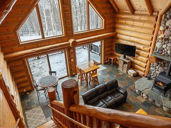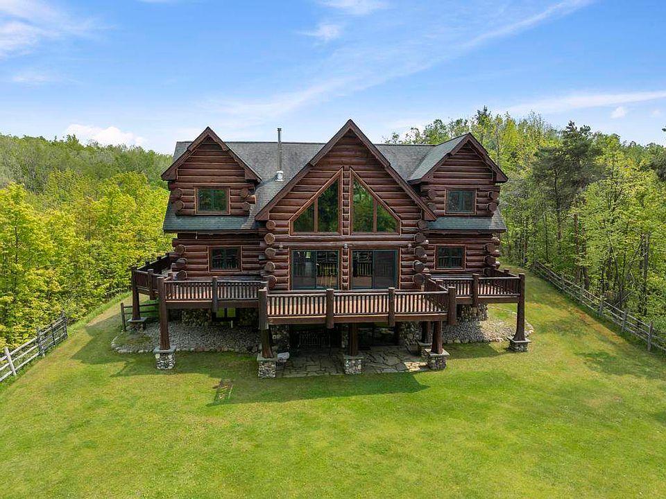If you’ve been searching for a home that feels private yet close to town, has Northern Michigan charm yet spacious, your search ends here. This stunning custom log home sits on five peaceful acres of mature woods and offers the perfect blend of rustic character and modern comfort, and is just minutes from downtown Petoskey and the lakeshore. Step inside to a dramatic living area with cathedral ceilings, a wall of windows, and an open layout that fills the home with natural light and beautiful woodland views. The kitchen is thoughtfully designed for both cooking and gathering, opening to the dining and living spaces that overlook the serene backyard. The main floor features a primary en-suite, full laundry room, and multiple access points to the wraparound porch where you can enjoy quiet mornings or evening sunsets. Upstairs, you’ll find additional en-suite bedrooms and a loft area that provides even more room for guests or flexible living. On the opposite side of the upper level, above the garage, a spacious finished bonus room includes its own full bath and laundry, offering a private and versatile space. The finished walkout lower level expands the living experience with tall ceilings, large windows, and access to the patio. This level includes a third en-suite, an additional bedroom, and a full bath, creating a bright and comfortable space for guests or family. Thoughtful storage areas are tucked away, allowing the living areas to feel every bit as refined and connected as the rest of the home. Outside, the fenced yard and surrounding trees create a private, park-like setting with plenty of space to enjoy Northern Michigan’s seasons. There’s room for an additional structure, such as a pole barn, for outdoor equipment or recreational vehicles. This exceptional home combines space, privacy, and timeless style in one of Petoskey’s most desirable areas.