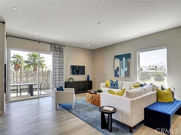 NEW BUILD LUXURY TOWNHOME with Palm Springs mere minutes from your front door! A bike ride, a stroll, or a moment's drive down Palm Canyon Drive and you are there! MOVE-IN READY with special Seller arranged financing available. FEE SIMPLE OWNERSHIP (not on leased land) and all the modern conveniences of new home construction, including an owned Solar system. Located in the new home community of Elan, visually framed by the breathtaking San Jacinto Mountains, this 2 Bedroom, 2.5 Baths and 2 car garage townhome boasts many interior upgrades, including a Glass Stair Rail, Light Gray Polished 12 x 24 tile flooring on the first floor, large quartz waterfall edged kitchen island including bar seating. Thermofoil cabinets with soft maple interiors and Grenada finish throughout home, includes soft close drawers and cabinets, full custom backsplash in kitchen, Stainless steel Bosch appliance package with free standing gas range with 6 burners, pyramid wall canopy hood, built -in Bosch microwave, dishwasher and single basin stainless-steel sink. Prewired for Whole house WI-FI with 2 access points, recessed lighting upgrades in all living areas, upstairs Laundry Room. Voluminous 9' and 10' ceilings, superb quality Milgard windows, fully insulated 2-car garage with steel roll up garage door, WI-FI garage door opener, including camera and Amazon MyQ/key. Ring doorbell included, pre-wired for ceiling fans in all living areas, pre-wired for a pair of speakers in the Great Room and upper deck. Private patio at first level and balcony off of all upstairs bedrooms. Pictures are of the model home for this floor plan and not the home offered for sale. Community amenities include a resort style community pool, dog park and bocce ball court.