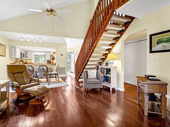 Serene lagoon views & moss draped live oaks invite you into this Summerwind villa. EZ access from Docksite Rd/Marina gate (w/ RFID), this attractively furnished townhome has many upgrades: silestone countertops, GE Profile glass cook top, oven, microwave, refrigerator, warming drawer, pendulum light fixtures, & Hansia designer kitchen faucet. Wood floors in L/D/K, tile on plexi-glassed porch & in bathrooms. Galley style kitchen w/ bar seating. Meals can be served at the dining table, too. Enjoy the gas fireplace ambiance in the living room. The primary BR opens to porch. Hallway has a full sized W/D closet. Guest BR shares hall bath. Full staircase (NO spiral) leads upstairs to carpeted loft w/ lots of natural light & 3rd bath w/ shower. Paved parking & storage below. Rental potential!