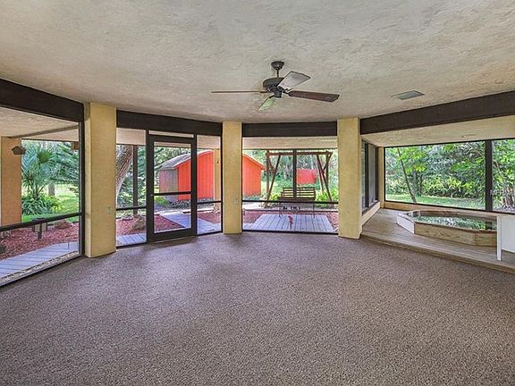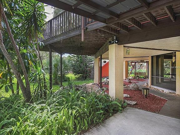 Custom-built and unique octagon-shaped home is situated in a very special location next to Alligator Creek. There are no deed restrictions, and you can park your truck, RV, or trailer onsite. Two sides of this home abut the massive tract of wooded green space of Woodmere Park. This location feels very secluded, yet is just minutes to all of life's necessities and amenities. The tropical garden-like feel, with lush ferns and mature oak trees, produces a very relaxing setting. A huge 600 sq ft ground-floor storage/utility area opens to a 575 sq ft. screened lanai and 750 sq ft outside porch. This outdoor area is open to the view to Alligator Creek but is shaded by the living area above giving you many outdoor entertainment options. This home is in excellent original condition, ready for the next owner's personal touches. Tired of the traditional Florida ranch homes and want something one of a kind? With two bedrooms, two bathrooms, plus den, 16-foot ceiling in living room and high ceilings throughout the house, this is it! Can you say location, location, location?