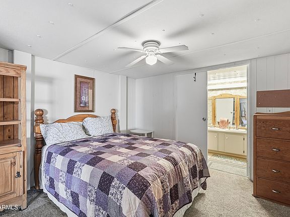 Beautifully maintained 2 bed, 2 bath manufactured home on 1.249 acres with gorgeous mountain views! This 1,050 sq ft home features newer paint, new flooring (2021), updated bathrooms (2017), a refreshed kitchen (2021), and a brand new AC unit (2024). Enjoy peaceful mornings or evening sunsets from the covered back deck. Plenty of room for horses, trailers, and RV parking with 30-amp hookup. Two large storage buildings with electricity serve as perfect ''she shed'' and ''he shed'' spaces. Most furniture available upon request. Move-in ready and full of country charm! Refrigerator does not convey.