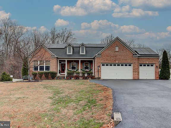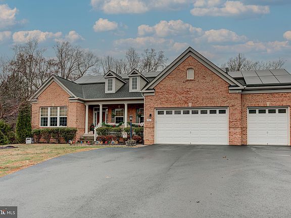 Discover comfort, style, and convenience in this beautifully maintained brick rambler tucked away in a quiet, hidden neighborhood of custom homes. Offering full main-level living plus a fully finished basement, this home features an open, light-filled floor plan with hardwood flooring and a spacious family room off the kitchen complete with a classic brick fireplace. The modern, updated kitchen boasts additional cabinetry, stainless steel appliances, a 5-burner cooktop, quartz countertops, and a stylish tiled backsplash, along with a sunroom/breakfast nook that invites natural light. A separate dining room off the foyer showcases elegant wainscoting and crown molding. The main level includes a generous primary suite with two walk-in closets and a luxurious bath featuring a jetted tub, large walk-in shower, and plantation shutters. There are also two additional bedrooms and an office for added space. The fully finished basement expands your living and entertaining space with two additional bedrooms, a third full bath, a recreation room, a wet bar/kitchenette, and a cozy den + lots of extra storage. Outdoor living is exceptional with a fenced backyard, double-level deck, patio, extensive hardscaping with fire pit, and an Integrity Swim Spa with split swim and jacuzzi jets. The home is situated on over two treed acres with a peaceful creek at the rear. Additional highlights include a large 3-car garage, expanded driveway for ample parking, storage shed, custom playground and owned solar panels providing impressive utility savings. Conveniently located near grocery shopping, outdoor recreation at Prince William National Forest Park, and offering easy access to I-95, I-66, and the VRE—this home truly has it all!