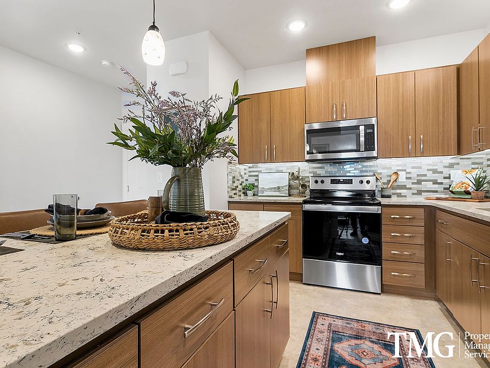 Welcome to resort-style living at 10 West, a brand-new 4-story building unlike anything the Tri-Cities has seen before! Your BRAND NEW, pet-friendly apartment home has an open floor plan with 1 bedroom, 1 bath, tall ceilings, plenty of natural light, a full-size washer and dryer, and a balcony/patio with incredible views. You'll love preparing meals in your modern kitchen with high-end finishes, including beautiful cabinetry, quartz counters, a full-height tile backsplash, under-cabinet lighting, stainless steel appliances, and a large island with room for seating. The spacious bedroom includes a ceiling fan and a large walk-in closet with built-ins, and the bathroom features quartz counters, a tile backsplash, and a tub/shower.