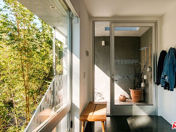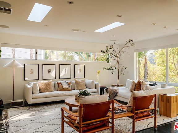 Perched above iconic Laurel Canyon and just moments from the Sunset Strip, this luminous mid-century modern flows effortlessly indoors and out for ultimate Hollywood Hills living. A chef's Viking kitchen with custom cabinetry and a bold island opens to a glass-walled living room crowned by nine skylights and a dramatic fireplace. Natural stone and wood floors lead to three bedrooms and two luxe baths, including a sun drenched primary suite that boasts a walk-in closet, spa bath, fireplace, and French doors opening to the resort-style outdoor living space. Saltwater pool, fountains, fire-pit, bar, outdoor shower, and multiple lounge/dining areas set the scene. The garage has been transformed into a sleek 300 SF art studio. The driveway and a private street space offer parking for 5 cars. Perfectly blending privacy and proximity, this elevated retreat offers an ideal balance of tranquility and city convenience. Whether entertaining beneath the stars or enjoying quiet mornings with canyon views, every moment here feels distinctly cinematic. Thoughtfully updated, yet true to its mid-century roots, this home captures the essence of Southern California living -- bright, open, and effortlessly sophisticated.