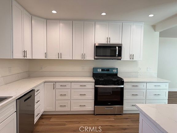 Beautifully remodeled 4-Bed, 3-Bath home on a quiet cul-de-sac street! Main house features 3 beds and 2 baths. Plus, ADU in the rear, (with separate private entrance). Both living spaces include Stainmaster vinyl flooring throughout, recessed lighting, and quartz kitchen & bath countertops. Separate individual laundry room inside off kitchen. Water softener. Covered patio off den, just outside the slider door and beautifully landscaped backyard. Dual pane windows and doors throughout. High efficiency heat-pump HVAC with Central A/C. 2-Car detached garage with RV Access including dedicated 50-AMP RV plug. Owner owned & paid-off SOLAR provides energy savings! Wheelchair access in front house. ADU in back has it's own mini-split heating & A/C system that's perfect for guests, extended family, or extra income. MOVE-IN READY and full of modern comfort!