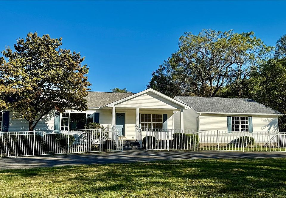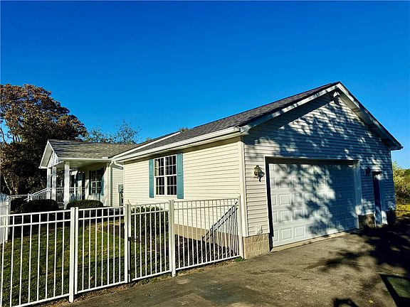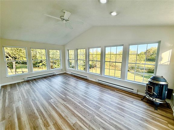 Welcome to this spacious ranch-style home set on over an acre of beautiful land! The circular governor’s driveway offers an impressive entrance and plenty of parking. Inside, you’ll love the open-concept layout connecting the living room, dining area, and kitchen—perfect for entertaining or gathering with family. Just off the back, a stunning sunroom with wraparound windows provides panoramic views of the hillside and property, creating a peaceful space to relax year-round. The main level features three comfortable bedrooms, including a primary suite with its own private bath. Downstairs, the expansive finished basement offers even more living space with three additional bedrooms and a flex room ideal for a home office or gym. Enjoy your mornings on the charming front porch or unwind in the partially fenced yard. Updates include new flooring throughout, a new furnace, and a new AC unit. A two-car detached garage completes this fantastic property.