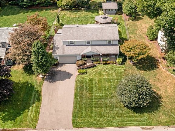 Quality abounds in this well loved and meticulously maintained home! The formal living room and formal dining room each have beautiful custom crown molding and wainscoting. Phenomenal kitchen has been updated with hardwood floors, Corian countertops on the side counter and island, maple soft-close cabinetry with pull out shelving, breakfast bar, under cabinet lighting, gas fireplace, and the focal point is the 16x22 addition with a custom crafted wood cathedral ceiling!! Pella windows in the addition have remote control blinds and a sliding glass door leading to the covered patio and concrete stamped patio with firepit. The family room has hardwood floors, gas fireplace, and built-ins. Convenient 1st floor updated 1/2 bath. On the 2nd floor is a large master bedroom with a walk in closet and an updated private full bathroom with double sinks. There are 3 more bedrooms on this floor and another updated full bath with a jetted tub. All of the bedrooms have hardwood floors under the carp