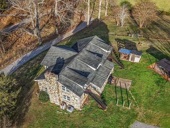 You'll fall in love with this timeless 2-level 3940 sq ft stone home, originally built in 1964 and thoughtfully updated to blend classic charm with modern comfort..Set on a peaceful and private 4.62-acre tract, this East Tennessee beauty offers the perfect balance of turnkey living and versatile land ideal for family life, multi-generational living, or rental income opportunities and the kind of peaceful, private country living that dreams are made of. As you approach your country retreat, you're greeted by a charming full-length front porch perfect for rocking chairs and sweet tea and welcomed into the home through gorgeous metal and glass doors—-truly a statement piece! Step inside where hardwood floors carry you through spaces that flow naturally, inviting conversation and connection at every turn. The main level features an open family and living area anchored by a stunning stone fireplace with a stove insert, an inviting dining area, and an open kitchen with abundant cabinets and counter space. Two bedrooms and two newly renovated bathrooms complete the main level.Venture upstairs to discover a complete family suite with a wood burning fireplace accompanied by three additional flexible rooms that adapt to your lifestyle. Whether you need a home office, craft studio, guest quarters this layout delivers remarkable versatility. The thoughtful design includes two separate entry and exit points, creating exceptional possibilities for multigenerational living arrangements. The basement provides even more space for seasonal items, hobby supplies, or whatever your storage needs might be. This property extends far beyond its stone walls. 4.62 acres of highly usable land unfold before you, featuring lush pastures perfect for horses, hobby farming, or simply enjoying wide-open spaces. Two barns offer endless possibilities for equipment storage, workshop space, or housing your four-legged friends. A charming chicken coop awaits your flock, while the gazebo entertainment area sits ready for barbecues, birthday parties, and lazy Sunday afternoons. Plenty of parking ensures guests always feel welcome, and the covered options within the barn protect vehicles from the elements. Country living at its finest rarely comes packaged so completely. From the original architectural character that gives this stone beauty its soul to the thoughtful updates that make daily life comfortable, every detail has been considered. Whether you're dreaming of a homestead, mini-farm, or simply a peaceful country escape, this home offers space, character, and endless potential. Discover the best of East Tennessee country living — make this one-of-a-kind property yours today!