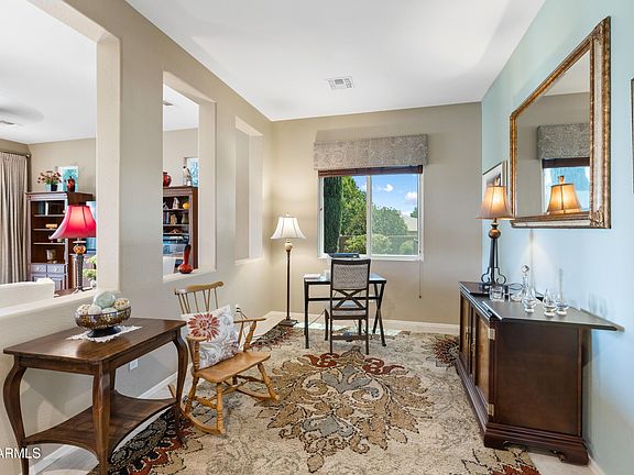 Endless panoramic views across the countryside and hills complement this highly upgraded immaculately maintained home. A formal entry way opens to an open design great room concept with a dedicated formal dining room. Beautiful easy care and durable porcelain tile floors throughout. The solid surface countertop kitchen with lower pull-out cabinets includes built-in GE stainless-steel wall oven and microwave along with a gas cooktop. The island breakfast bar provides a nice buffer to the great room. The split bedroom design provides excellent privacy for all; use your imagination on using the middle den, which could be converted to a third bedroom. The primary bathroom includes a soaking tub, walk-in shower, dual vanities, water closet, and custom shelving in the walk-in closet. One of the favorite features of this design is the Smart Space room that provides a large walk-in pantry, lots of cabinet/granite countertop space, and a laundry sink next to the washer/dryer. The formal dining room has a glass door for grill-to-table meals on the large covered patio or enjoy your meal on the patio watching the cattle graze and an occasional herd of pronghorn. A fully landscaped front and rear yards are designed for beauty as well as minimal maintenance. The Quailwood Community Center provides a great place to meet your neighbors or take advantage of the, fitness center, banquet room, sauna, pool & spa, men's and women's locker rooms, bocce ball & horseshoe courts, tennis & pickleball court's, basketball court, outdoor patio with BBQ, great room, and computer for resident use.