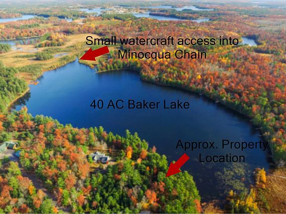 Well wooded lakefront lot only 10 minutes from downtown Minocqua. This large pine studded lot will be the envy of those that visit. Generously sized parcel of nearly 2 AC and 200 feet of frontage on a 40 plus acre BAKER lake. A small watercraft could access the Minocqua chain (think fishing boat/canoe or kayak). Only 5 minutes to the Bearskin State Trail-you can walk, bike or snowmobile right from the property to access it. Former home was removed a number of years ago and paved driveway remains along with a 6 inch drilled well. Newer, contractor installed steps bring you to the lake where pilings from a former pier remain. Sand frontage needs a little love-and it will be ready for swimming again. Numerous larger recreational lakes nearby for more fun, and then come home to quietness & serenity with this one. Bring your building plans & vision for a residential or secondary home to this fantastic location, and start enjoying it as your own.