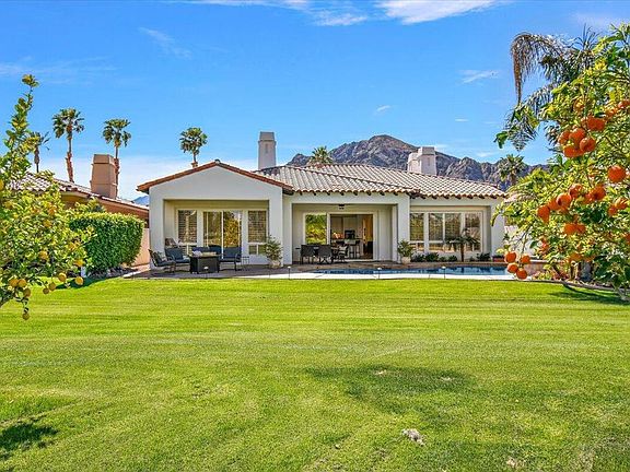 Stunning Home in Citrus Country Club - Your Desert Oasis Awaits!Nestled in the heart of the prestigious Citrus Country Club, this exceptional home is perfectly positioned between the 13th and 14th holes of the renowned Pete Dye course. Enjoy breathtaking views of the Chocolate Mountains, a serene lake with a fountain, and lush greens, all while watching the golfers but no errant balls or cart paths to worry about!The open-concept layout is designed with both relaxation and entertaining in mind. Featuring two spacious master suites, an en-suite guest room on the opposite side of the home for ultimate privacy, and a flexible 4th bedroom that can easily double as a home office or an additional guest space. The gourmet kitchen is a chef's dream, with granite countertops, a gas cooktop, double oven, and a long bar perfect for casual dining or entertaining.Just steps from the kitchen, the formal dining room leads to a charming courtyard, offering sweeping views of the Santa Rosa Mountains--an ideal spot to relax or entertain.Come and enjoy the desert lifestyle with a sprawling patio, large pool and spa, built-in BBQ, and a covered dining area perfect for the warm evenings. Plus, with your own personal citrus grove in the backyard, you can pick fresh lemons, grapefruits, and oranges whenever you like!Meticulously maintained by its current owners, this home is move-in ready and offers the perfect blend of luxury and comfort. The AC units have been replaced within the last 4 years, the pool pump is new, the hot water heater is less than a year old! Come see this rare gem today--where stunning views, luxurious living, and unparalleled privacy come together to create your dream home.