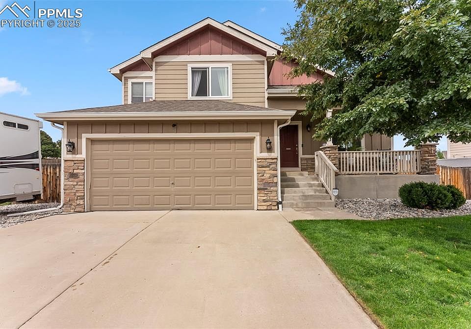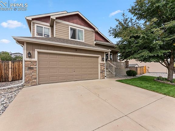 Check out this lovely home nestled in a peaceful Fountain community, just minutes from Fort Carson, shopping, scenic trails, and schools. This home features a spacious 3-car tandem garage and sits on a premium lot that backs and sides to green space—offering unmatched privacy, serenity and mountain views. Step onto the expansive front porch and into a sun-drenched main level with soaring ceilings, gleaming hardwood floors, and a stylish dine-in kitchen equipped with recessed lighting and stainless-steel appliances. Upstairs, you'll find all three bedrooms, including a owner's suite with a spa-inspired 5-piece ensuite bath. The additional bedrooms are generously sized and connected by a convenient Jack & Jill bathroom. The lower level opens to a versatile second living area with french doors leading to an entertainer’s paradise: an oversized backyard with extended concrete patio and more of those breathtaking views of the Front Range. An unfinished basement awaits your vision—already pre-plumbed for a future bathroom and offering space for two additional bedrooms or a custom retreat. Don’t miss your chance to own this beautiful Colorado home. Schedule your showing today and experience the perfect blend of comfort, style, and location!