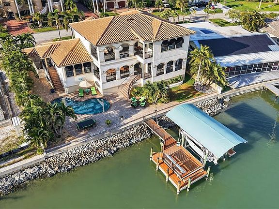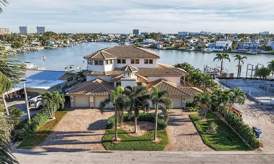 Welcome to Yacht Club Estates! This 3-bedroom, 3-bath home private office home offers over 3,600 sq. ft. of waterfront living on a rare cul-de-sac lot with 100 feet of waterfront. Enjoy a custom dock with a 32’ lift, water, electric, solar lighting, and a newer seawall (2019). Built with 2x6 insulated walls and impact windows, the home is elevated so the main living areas stayed dry during recent storms.Inside, you’ll find open living and dining areas that lead to a large waterfront terrace—perfect for entertaining. The kitchen features Viking appliances, quartzite countertops, a wine cooler, and an ice maker. The entire upper level is a private owner’s suite with a balcony, dual closets, and a spa-style bathroom.Additional features include two guest bedrooms, a dedicated office, a heated saltwater pool, and two 2-car garages. With direct access to Boca Ciega Bay, the Gulf, nearby beaches and downtown St. Pete, this home offers the best of waterfront living.