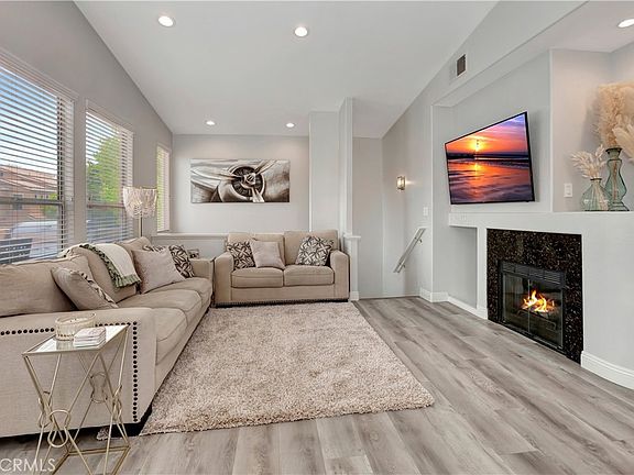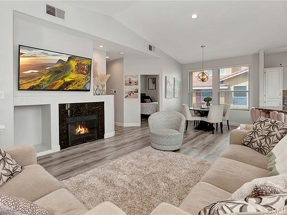 Indulge in the comfortable, easy-care lifestyle you crave in this incredible 2-bedroom, 2-bath condo residence at Monaco in Anaheim Hills! Venture up the entry staircase into the main-level entertainment areas where vaulted ceilings, picture windows, and gorgeous wide-plank flooring create a bright and lively atmosphere. An inviting fireplace warms the living room, while elegant pendant lighting sets an intimate mood in the dining corner. Cooking is a delight in the sunlit kitchen with Frigidaire stainless steel appliances, ample cabinetry, gleaming granite countertops, and a two-seater breakfast island.