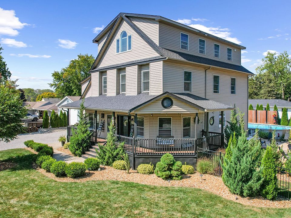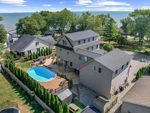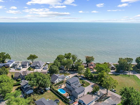 Located in Avalon Beach, this beautifully updated home with pool and oversized garage (~27x31) offers lake Erie views and stylish living throughout. Features include hardwood floors, an elegant kitchen and an open-concept 1st floor with new vinyl flooring (2023), shiplap wall, and electric fireplace. New carpet in bedrooms & stairs plus epoxy floor in garage (2025). Enjoy the wraparound porch and panoramic lake views from the 3rd floor. Outdoor upgrades include Trex deck (2022), patio (2021), and black steel fence/gate (2023). Two new furnaces (2023/24) and a garage heater (2023). Data & measurements approx. & not guaranteed. BUYER/BATVI.
