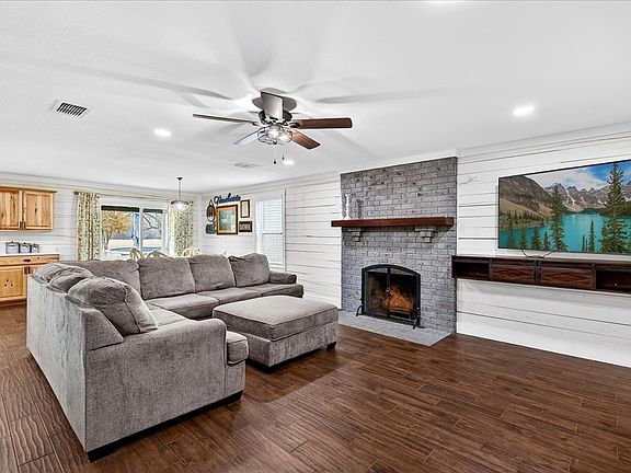 Brick fireplaceCharming cabinCovered outdoor entertaining areaTornado shelterRecessed dimmable lightsCeiling fansTile floors