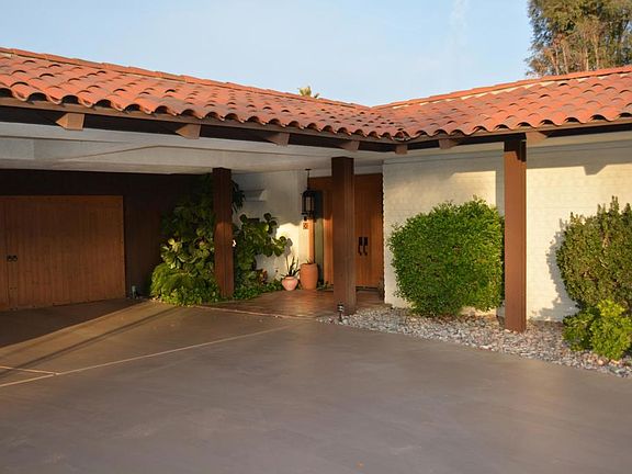 Designed by renown mid century architect, Hugh Kaptur, this classic Mid-century Modern home with floor to ceiling windows, was transformed into a Santa Barbara ranch style with the addition of Saltillo pavers, wood wrapped support columns and clay tile faux roof treatment, all the while maintaining the clean, open look of the 1960s architectural period. Home has unobstructed views of the golf course and mountains. Featuring 3 bedrooms & 3 baths, the open concept family, dining, and living room, all access the expansive patio with sparkling 40' long pool, BBQ island and misting system, making this home an entertainer's delight. Situated on the 7th tee & 6th green of the Bermuda Dunes Classic One golf course, the pool area can be open to the course view, or the surround Ficus hedge can be grown to provide complete privacy. The circular drive leads to a two car garage, attached golf cart garage, currently converted into an hobby/craft studio, which are all connected to a large portico with covered parking for 6. Kitchen and Main bath have undergone a recent remodel. Prior expansions and conversions have increased original square footage by almost five hundred sq/ft. Seller requires 60 day lease back after closing. Listing agent is property owner.
